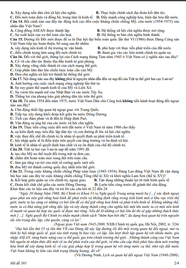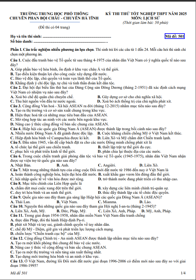 Đề Thi Thử Tốt Nghiệp THPT Năm 2025 Môn Lịch sử Trường THPT Chuyên Hà Tĩnh 501 Có Đáp Án