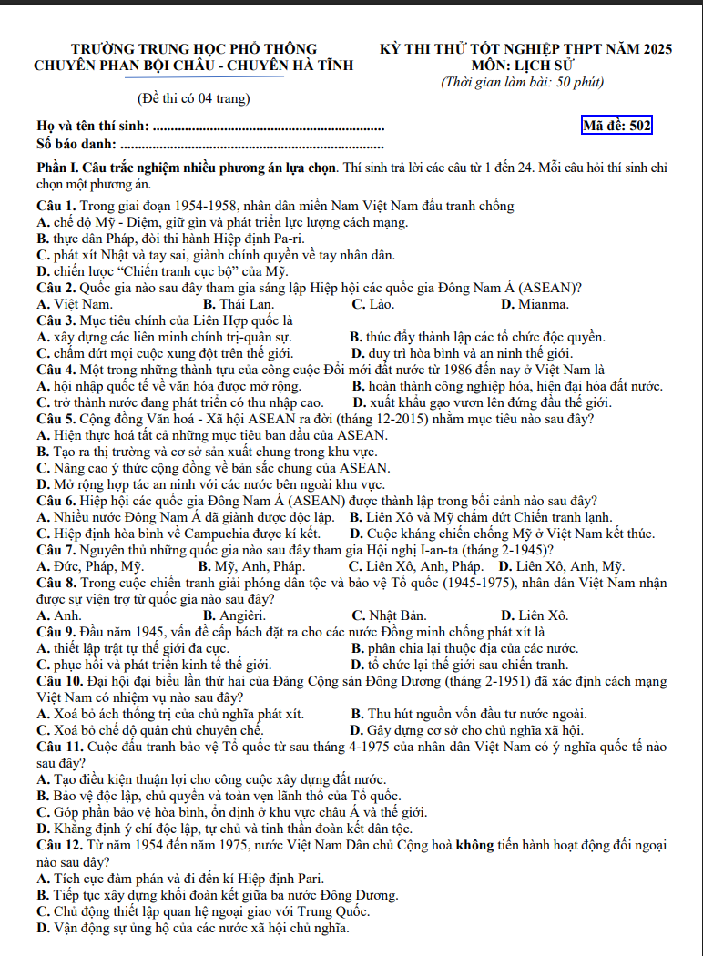 Đề Thi Thử Tốt Nghiệp THPT Năm 2025 Môn Lịch Sử Trường THPT chuyên Hà Tĩnh 502 Có Đáp Án