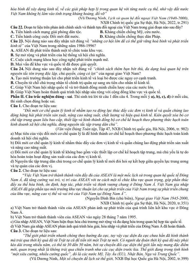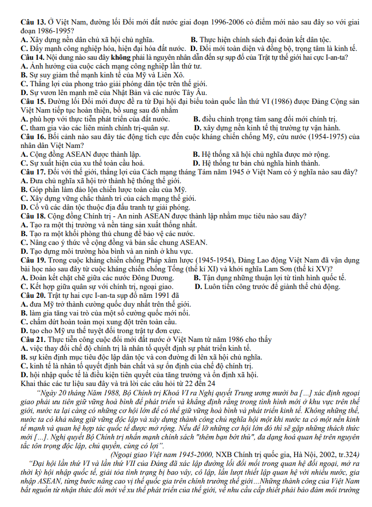 Đề thi được biên soạn theo định hướng cấu trúc của Bộ GD&ĐT, bao phủ các nội dung trọng tâm: lịch sử Việt Nam hiện đại, hai cuộc kháng chiến, công cuộc xây dựng và đổi mới đất nước, cùng những sự kiện quan trọng của lịch sử thế giới. Hệ thống câu hỏi được phân hóa theo nhiều cấp độ, hỗ trợ học sinh phát triển tư duy phân tích – tổng hợp, tăng khả năng ghi nhớ sự kiện và nâng cao hiệu quả ôn tập trong giai đoạn chuẩn bị cho kỳ thi THPT năm 2025.
