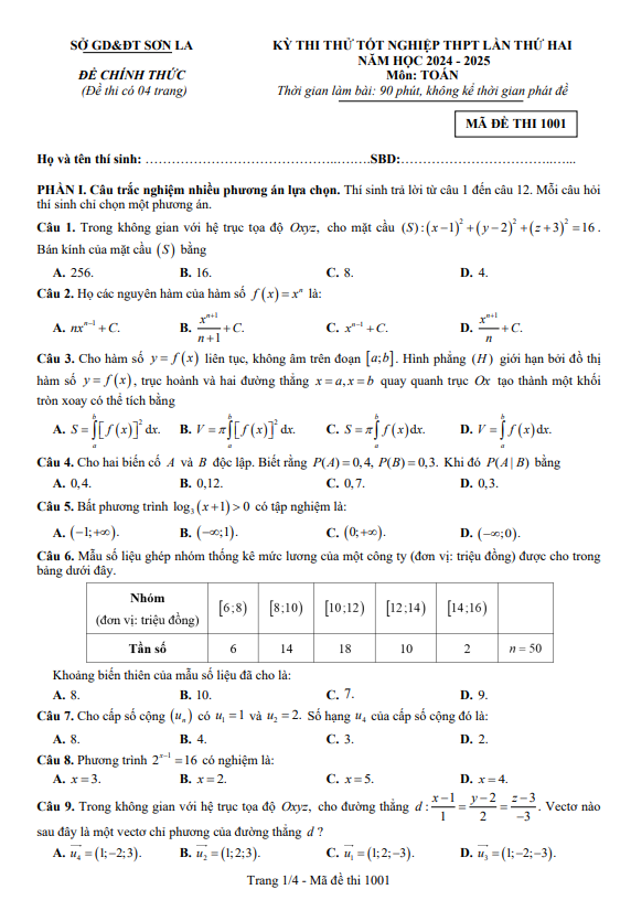 Đề thi thử tốt nghiệp THPT năm 2025 môn Toán sở GD&ĐT Sơn La – Lần 2