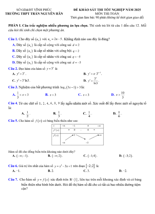 Đề thi thử tốt nghiệp THPT năm 2025 môn Toán sở GD&ĐT Vĩnh Phúc – Trường THPT Trần Nguyên Hãn