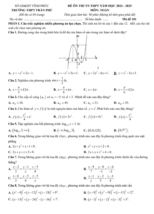 Đề thi thử tốt nghiệp THPT năm 2025 môn Toán sở GD&ĐT Vĩnh Phúc – Trường THPT Trần Phú