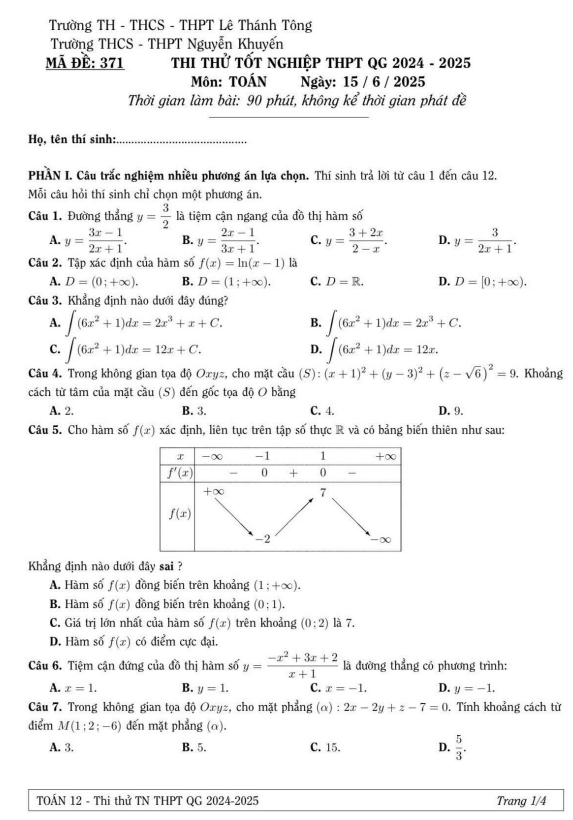 Đề thi thử tốt nghiệp THPT năm 2025 môn Toán trường THPT Nguyễn Khuyến & Lê Thánh Tông – TP HCM