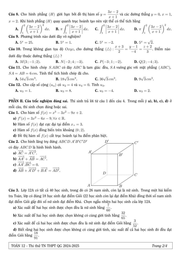 Đề thi bao gồm đầy đủ những chuyên đề trọng tâm như hàm số, mũ – logarit, nguyên hàm – tích phân, số phức, hình học không gian, xác suất – thống kê… Hệ thống câu hỏi được thiết kế từ mức độ cơ bản đến vận dụng cao, giúp học sinh củng cố nền tảng kiến thức, phát triển tư duy và rèn luyện khả năng giải toán nhanh – chính xác trong điều kiện thời gian hạn chế.