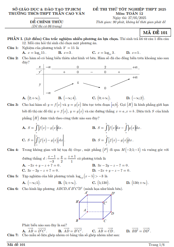 Đề thi thử tốt nghiệp THPT năm 2025 môn Toán trường THPT Trần Cao Vân – TP HCM